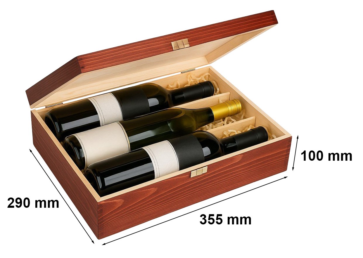 Te stylowe drewniane pudełka zaprojektowane są z najwyższej jakości drewna sosnowego. Dzięki dodatkowym przegrodom i miękkim wypełnieniem wewnątrz, pudełko chroni wino przed uszkodzeniami.