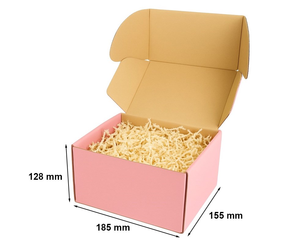 Różowy karton fasonowy 185x155x128 mm to trwałe i estetyczne opakowanie wykonane z tektury 3-warstwowej o fali E i gramaturze 420 g/m². Dzięki konstrukcji wykrojnikowej z automatycznym zamknięciem pudełko jest niezwykle wygodne w użytkowaniu i nie wymaga użycia taśmy klejącej. To ekologiczne rozwiązanie, które łączy funkcjonalność z atrakcyjnym wyglądem, dlatego świetnie sprawdza się w handlu internetowym oraz pakowaniu upominków.