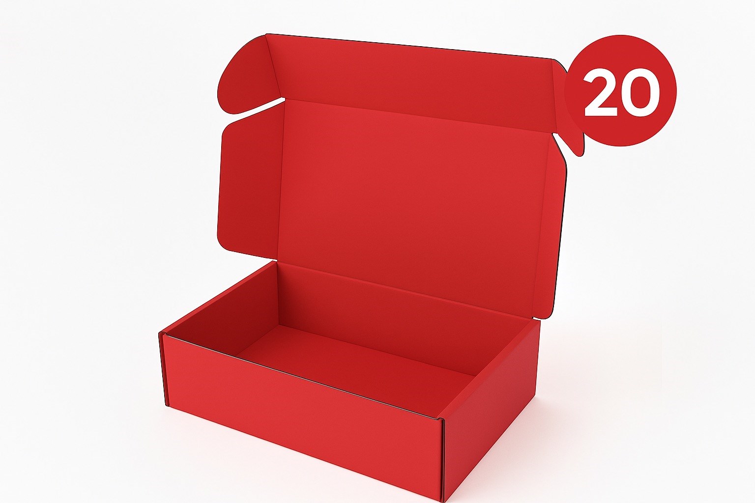 Wytrzymały karton wykrojnikowy w intensywnym czerwonym kolorze to solidne rozwiązanie do pakowania, wysyłki i przechowywania produktów. Wykonany z tektury falistej o gramaturze 400 g/m², zapewnia doskonałą ochronę zawartości przed uszkodzeniami. Konstrukcja FEFCO 427 umożliwia szybkie i wygodne składanie bez taśmy klejącej, co zwiększa efektywność pracy. Dostępny w pakiecie 20 sztuk – idealny dla firm wysyłkowych i sklepów internetowych.