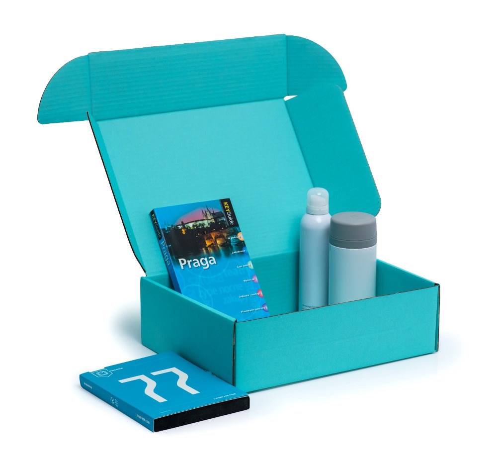 Turkusowe pudełko fasonowe wyróżnia się intensywną barwą i estetyczną, jednolitą powierzchnią. Prosta bryła opakowania podkreśla uporządkowaną prezentację zawartości i nadaje jej nowoczesny wygląd. Kolor dobrze komponuje się z jasnymi oraz kraftowymi wypełnieniami, tworząc spójny efekt wizualny. Opakowanie sprawia wrażenie solidnego i eleganckiego.