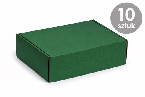 Karton wykrojnikowy (fasonowy) w kolorze zielonym o wymiarach 330×250×100 mm w zestawie 10 sztuk wykonany z tektury falistej o strukturze fala E i gramaturze 350 g/m². Konstrukcja wykrojnikowa umożliwia szybkie składanie bez użycia taśmy, co usprawnia proces pakowania. Dodatkowo fala E zapewnia estetyczne wykończenie oraz odpowiednią ochronę zawartości.