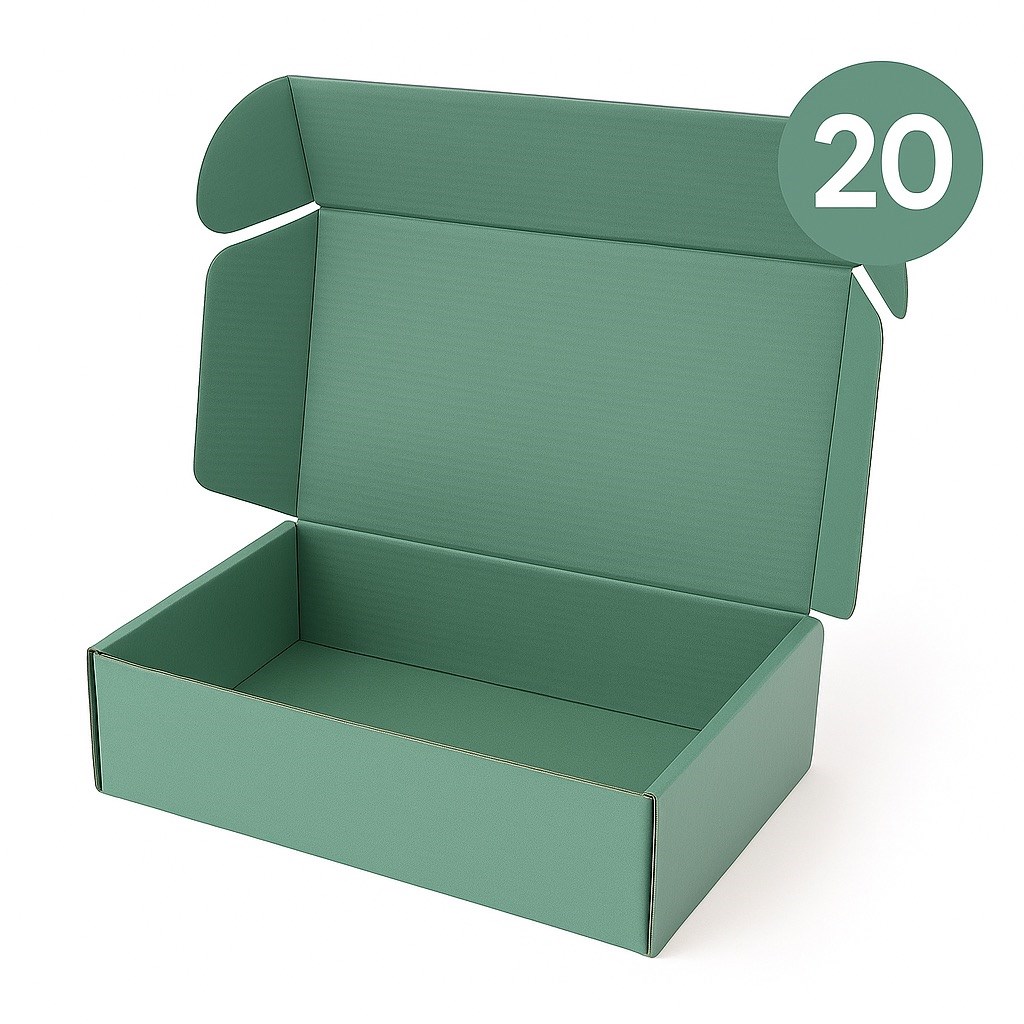 Trwały karton wykrojnikowy w kolorze szałwiowym (Pantone 5565) to solidne, funkcjonalne opakowanie do pakowania, wysyłki i przechowywania produktów. Wykonany z mocnej tektury falistej o gramaturze 400 g/m², zapewnia wysoką odporność na uszkodzenia. Konstrukcja FEFCO 427 umożliwia szybkie składanie bez taśmy klejącej, co przyspiesza proces pakowania. Wydajny pakiet 20 sztuk sprawdzi się doskonale w firmach wysyłkowych, magazynach i e-commerce.