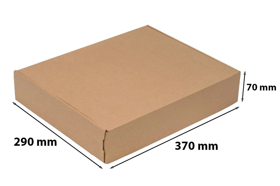 Karton fasonowy o wymiarach 370×290×70 mm to funkcjonalne opakowanie przeznaczone do wysyłki i przechowywania płaskich produktów. Konstrukcja wykrojnikowa F427 umożliwia szybkie złożenie bez użycia taśmy pakowej, a pasek klejący zapewnia bezpieczne zamknięcie kartonu. Trójwarstwowa tektura falista o fali B skutecznie chroni zawartość przed zagnieceniami i uszkodzeniami. Format opakowania jest dopasowany do Paczkomatu InPost Gabaryt A.