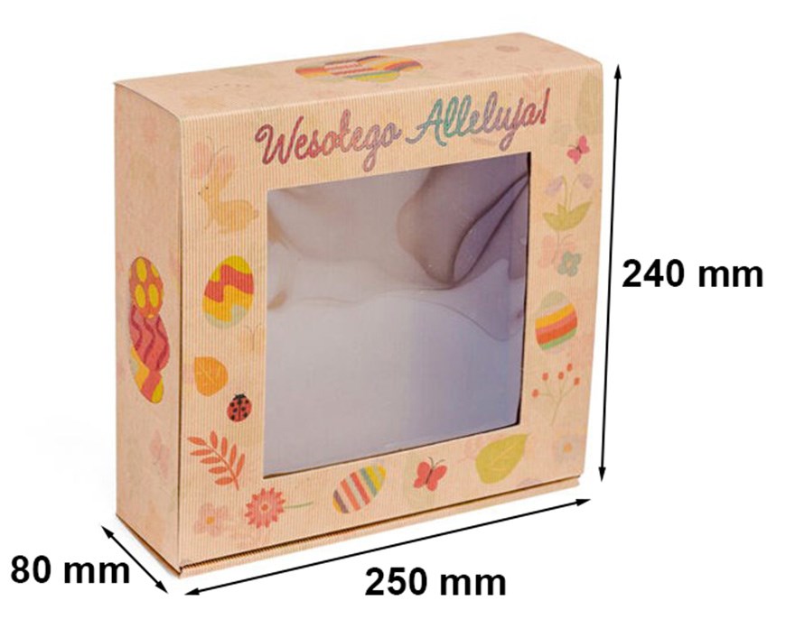 Stylowy i funkcjonalny karton z okienkiem, ozdobiony motywem świątecznym "Alleluja", to doskonałe opakowanie na wielkanocne upominki. Jego wyjątkowy design podkreśla radosny charakter świąt, a solidna konstrukcja zapewnia bezpieczeństwo przechowywanych przedmiotów.