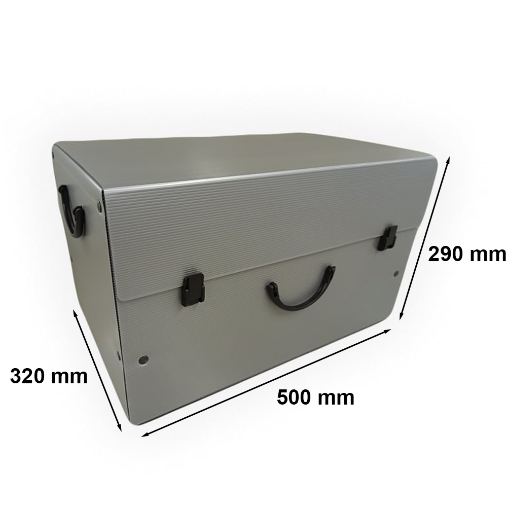 Kufer archiwizacyjny o wymiarach 500x320x290 mm w srebrnym kolorze jest lekki dzięki wykonaniu z płyt kanalikowych z polipropylenu. Nieraz z pewnością zdarzyło ci się widzieć karton, który po przechowywaniu w wilgotnych warunkach zmienił swoją strukturę. W tym przypadku mamy do czynienia z materiałem, który jest wodoodporny, co daje możliwość przechowywania w pomieszczeniach o zwiększonej wilgotności, takich jak strych czy inne tego typu miejsca.