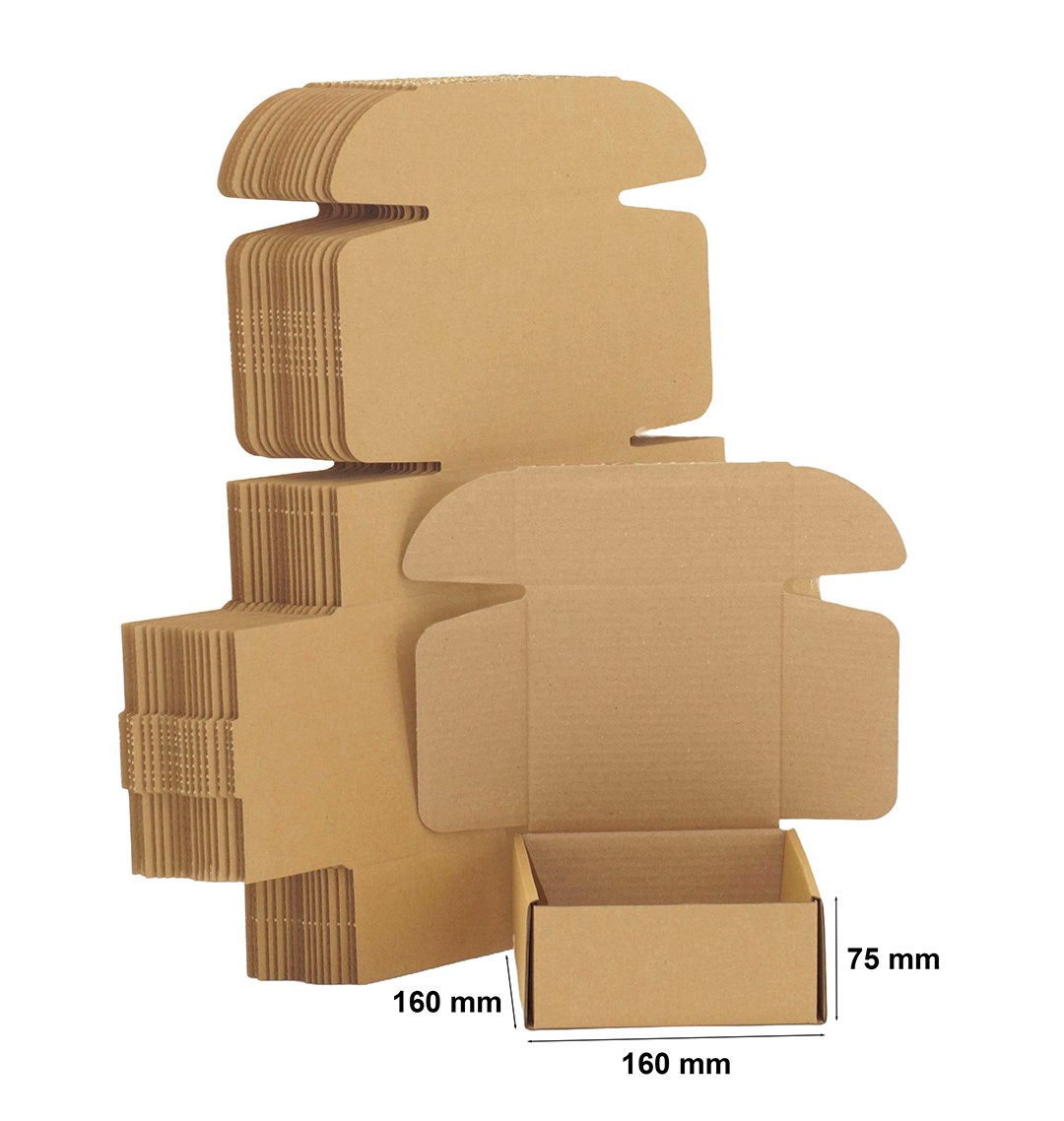 Pakiet obejmuje 10 sztuk kartonów wykrojnikowych, każdy o wymiarach 160 x 160 x 75 mm. Kartony wykonane są w klasycznym brązowym kolorze, z tektury falistej B, o gramaturze 400 g/m².