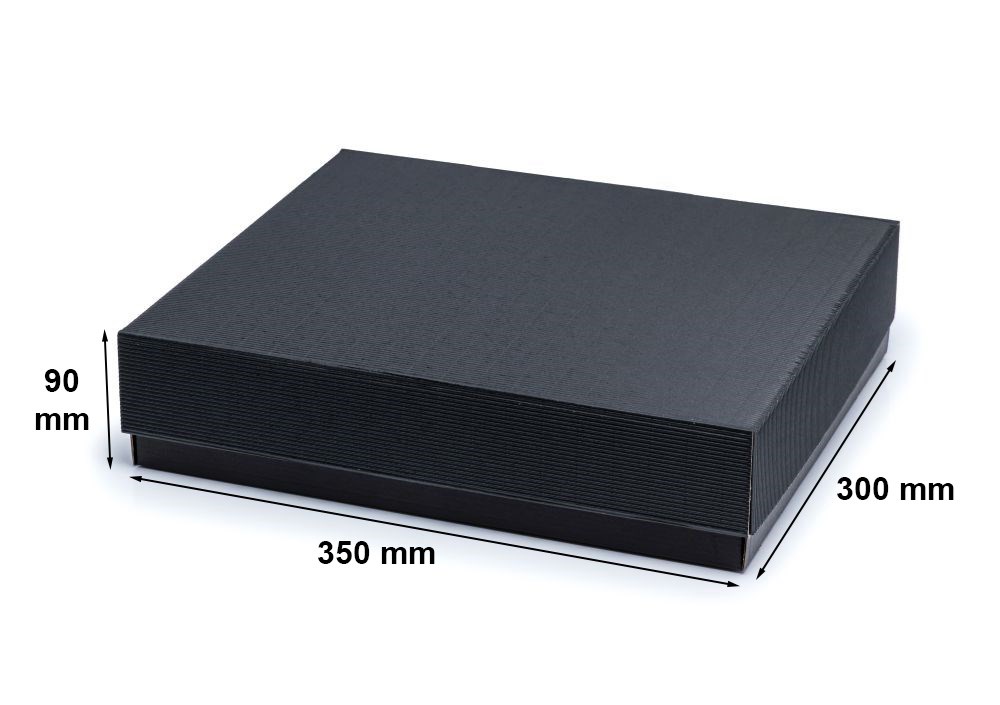 Ekskluzywne pudełko o karbowanej strukturze w głębokim czarnym kolorze to idealne rozwiązanie dla osób ceniących elegancję i praktyczność. Świetnie sprawdzi się do pakowania dokumentów, odzieży, galanterii czy prezentów. Wykonane z trwałego kartonu wieczkowego o gramaturze 450 g/m², zapewnia estetyczny wygląd i solidną ochronę zawartości. Dzięki uniwersalnym wymiarom jest funkcjonalnym wyborem zarówno w domu, jak i w biznesie.