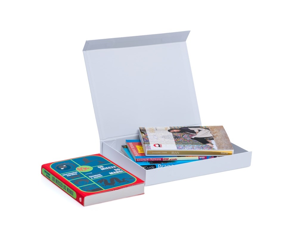 Minimalistyczne i stylowe płaskie pudełko magnetyczne w kolorze białym, o wymiarach 280 x 210 x 40 mm. Wykonane z papieru powlekanego zgodnego z normą RoHS, tektury falistej oraz sztywnej tektury introligatorskiej o grubości 2,3 mm. Pokryte matową folią odporną na zarysowania, która zapewnia dodatkową ochronę. Konstrukcja składana umożliwia szybki montaż bez użycia kleju. Pudełko posiada pełną magnetyczną klapę z dyskretnie ukrytymi magnesami, co zapewnia nowoczesny wygląd i wygodne zamknięcie.