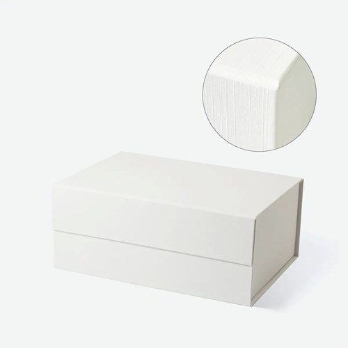 Połączenie papieru artystycznego z tekturą falistą i szarą tekturą zapewnia trwałość opakowania. Głęboki format zwiększa możliwości pakowania różnorodnych produktów. Ukryte magnesy podnoszą estetykę i funkcjonalność zamknięcia. Jasny odcień off white podkreśla elegancki charakter opakowania.