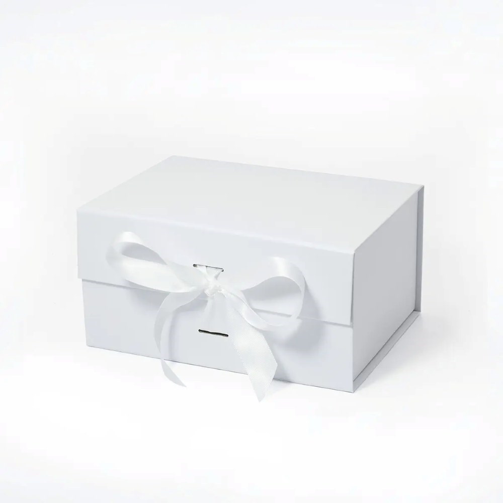 Pudełko magnetyczne B6 białe z wstążką 200×150×100 mm