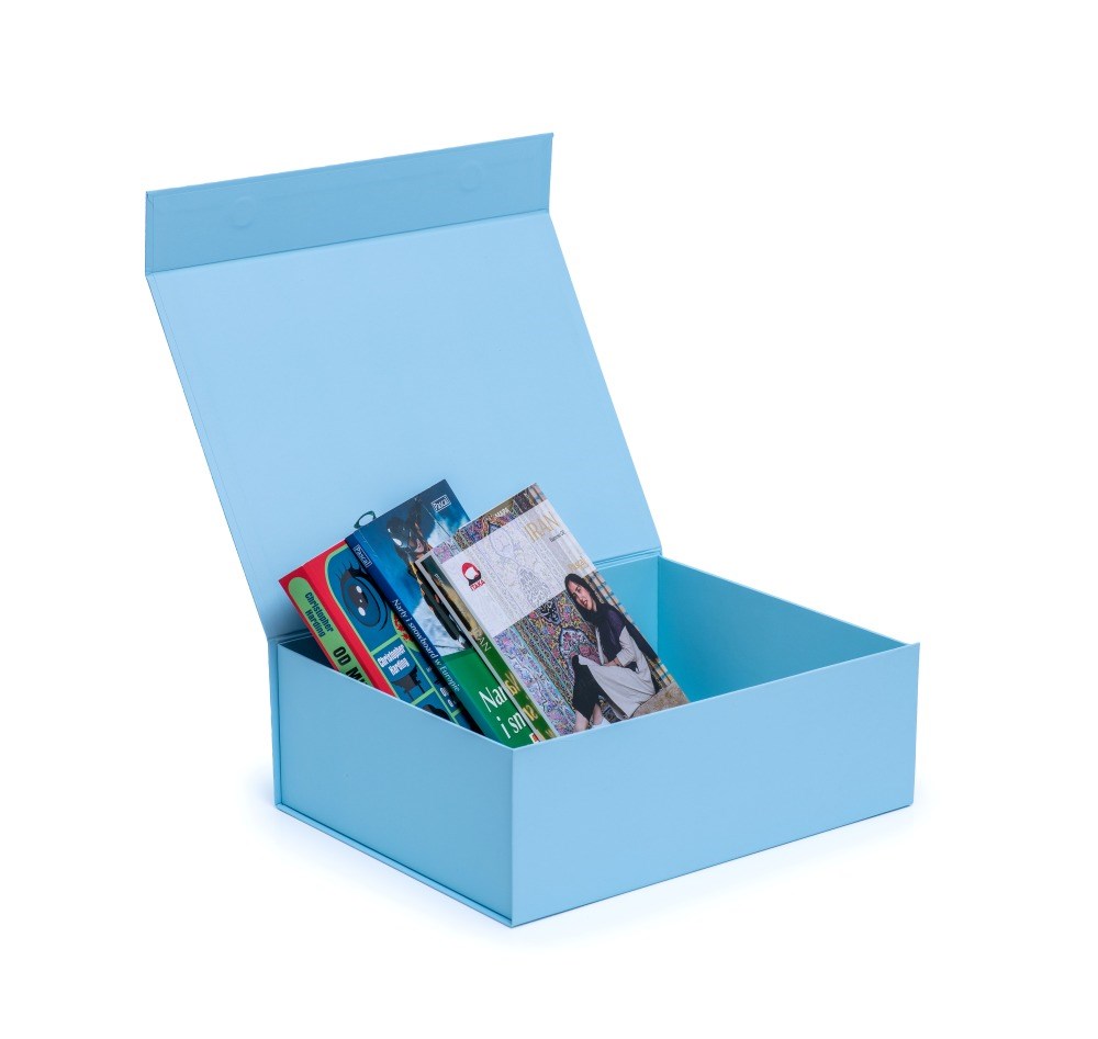 Ekskluzywne pudełko magnetyczne w rozmiarze A4 (330x255x115 mm) w delikatnym błękitnym kolorze, zbliżonym do Pantone 283C. Wykonane z wysokiej jakości papieru powlekanego zgodnego z normą RoHS, tektury falistej oraz solidnej tektury introligatorskiej o grubości 2,3 mm. Składana konstrukcja z magnetycznym zamknięciem umożliwia szybki montaż bez użycia kleju, gwarantując elegancki wygląd i doskonałą ochronę produktów premium.