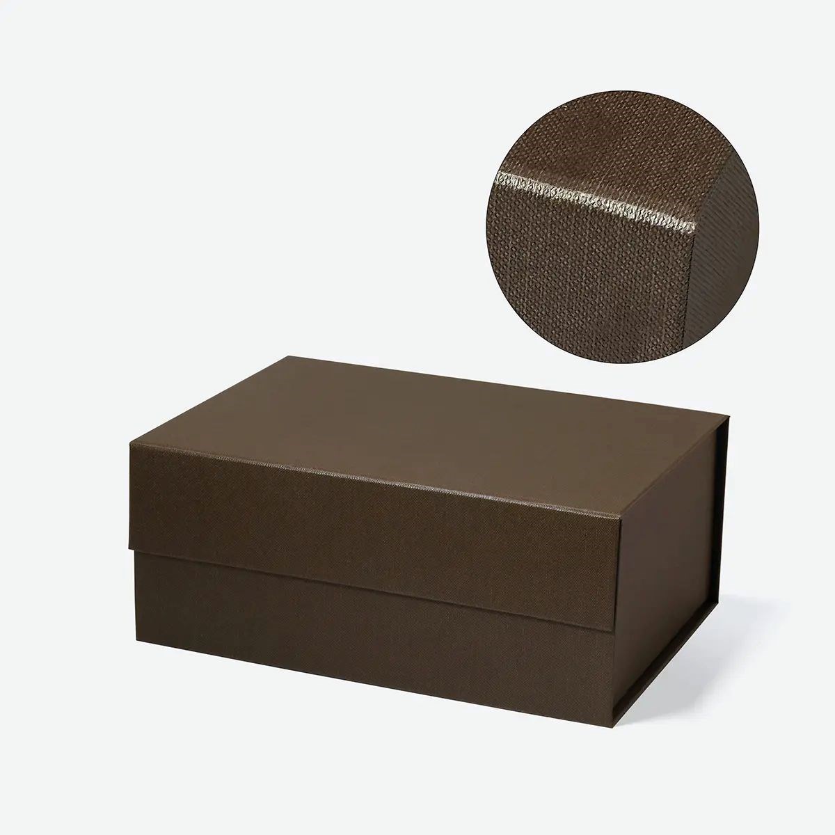 Wysokiej jakości papier artystyczny w połączeniu z tekturą falistą i szarą tekturą wpływa na trwałość opakowania. Matowa laminacja anti-scratch chroni powierzchnię przed zarysowaniami. Głęboki format pozwala na pakowanie produktów o większej objętości. Stonowany brązowy kolor podkreśla profesjonalny charakter opakowania.