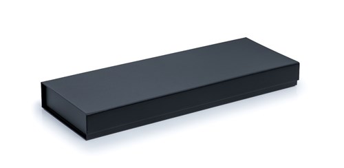 Pudełko magnetyczne F3 (500x180x53 mm) w eleganckim czarnym kolorze, wykonane z papieru powlekanego zgodnego z normą RoHS, tektury falistej i solidnej tektury introligatorskiej o grubości 2,3 mm. Pudełko posiada pełne magnetyczne zamknięcie oraz matową powłokę odporną na zarysowania, zapewniając elegancję i funkcjonalność dla najbardziej wymagających klientów.