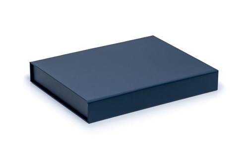 Stylowe i nowoczesne płaskie pudełko magnetyczne w kolorze granatowym (zbliżonym do Pantone 7463C), o wymiarach 280x 210 x 40 mm Wykonane z papieru powlekanego zgodnego z normą RoHS, tektury falistej i introligatorskiej tektury o grubości 2,3 mm. Matowe wykończenie z powłoką antyzarysową zapewnia estetykę i trwałość. Składana konstrukcja pozwala na szybki montaż bez użycia kleju, a pełna klapa magnetyczna z ukrytymi magnesami nadaje pudełku elegancki wygląd i solidność zamknięcia.