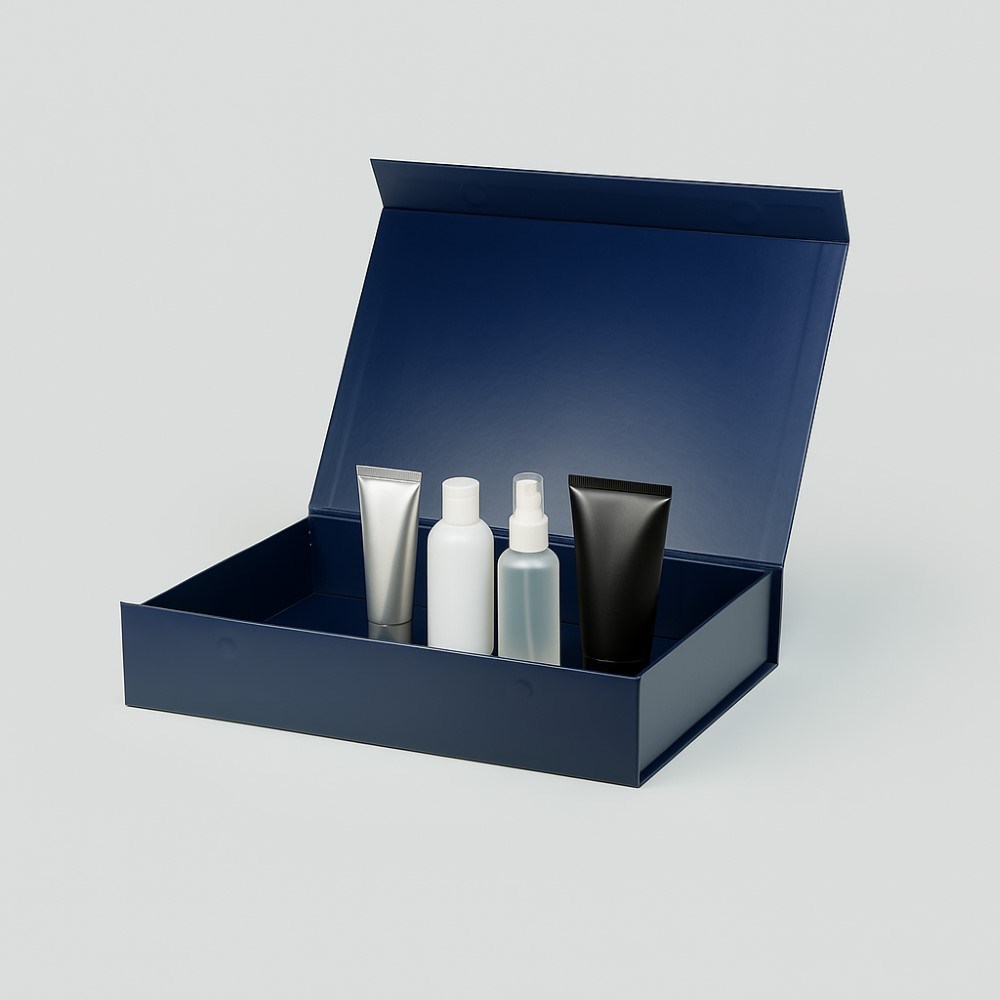 Ekskluzywne pudełko magnetyczne w rozmiarze A4 (330x255x70 mm) w eleganckim granatowym kolorze, zbliżonym do Pantone 7463C. Wykonane z wysokiej jakości papieru powlekanego zgodnego z normą RoHS, tektury falistej oraz solidnej tektury introligatorskiej o grubości 2,3 mm. Pudełko posiada matowe wykończenie odporne na zarysowania oraz półmagnetyczne zamknięcie, umożliwiające szybki montaż bez użycia kleju. Zapewnia prestiżowy wygląd i ochronę produktów premium.