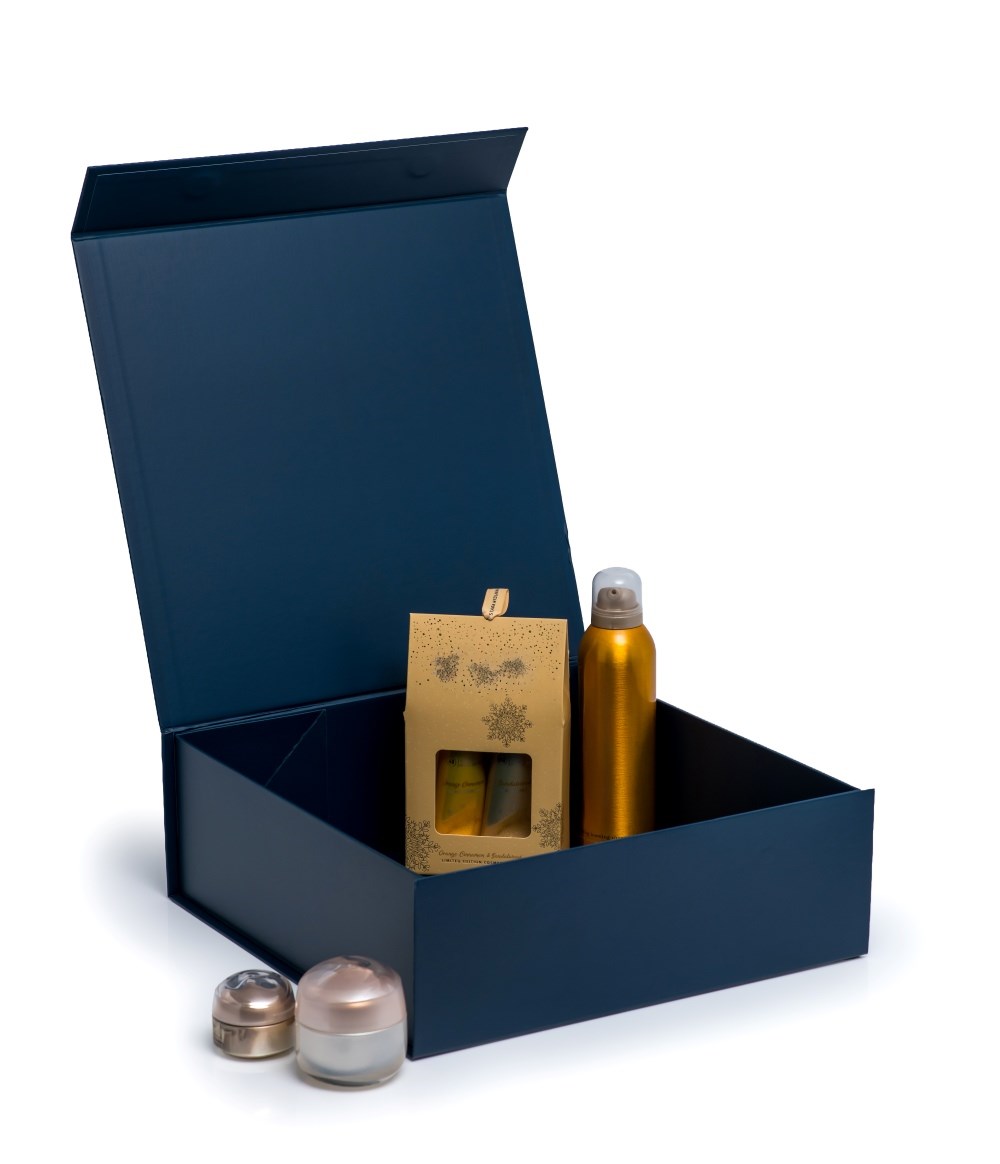 Ekskluzywne pudełko magnetyczne w rozmiarze A4 (330x330x115 mm) w stylowym granatowym kolorze, zbliżonym do Pantone 7463C. Wykonane z wysokiej jakości papieru powlekanego zgodnego z normą RoHS, tektury falistej oraz solidnej tektury introligatorskiej o grubości 2,3 mm. Posiada matowe wykończenie odporne na zarysowania oraz półmagnetyczne zamknięcie. Składana konstrukcja zapewnia szybki montaż bez użycia kleju, oferując estetyczny wygląd i solidną ochronę produktów premium.