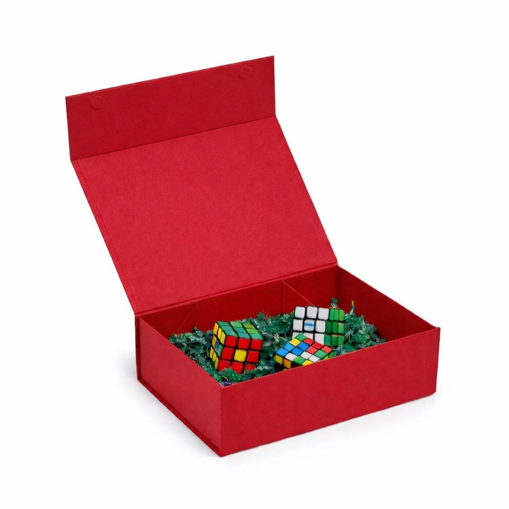 Pudełko magnetyczne o wymiarach 350×250×100 mm przeznaczone jest do pakowania produktów oraz zestawów wymagających stabilnej i estetycznej oprawy. Sztywna, lita tektura o gramaturze 850 g/m² zapewnia ochronę zawartości podczas transportu i przechowywania. Składana konstrukcja ułatwia magazynowanie pudełek przed użyciem oraz sprawne przygotowanie opakowania. Odcień jagodowej czerwieni Pantone 200C nadaje całości wyrazisty, a jednocześnie uporządkowany charakter.