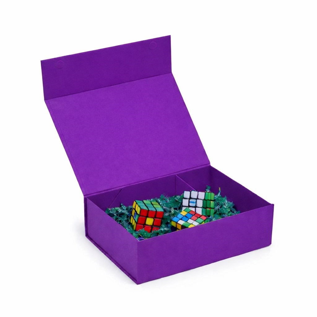 Pudełko magnetyczne o wymiarach 350×250×100 mm przeznaczone jest do pakowania produktów oraz zestawów wymagających stabilnej i estetycznej oprawy. Sztywna, lita tektura o gramaturze 850 g/m² zapewnia ochronę zawartości podczas transportu i przechowywania. Składana konstrukcja ułatwia magazynowanie pudełek przed użyciem oraz sprawne przygotowanie opakowania. Kolor jagodowego fioletu Pantone 2602C nadaje całości wyrazisty, a jednocześnie uporządkowany charakter.