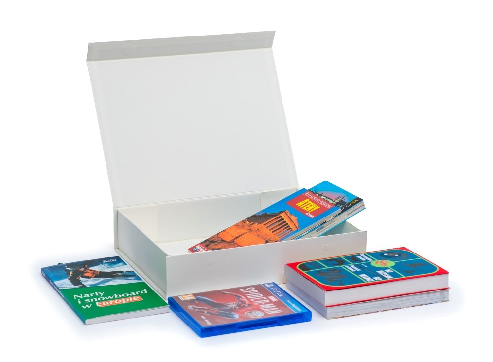 - Materiał: papier powlekany zgodny z RoHS, laminowany matowo, tektura falista, tektura introligatorska 2,3 mm