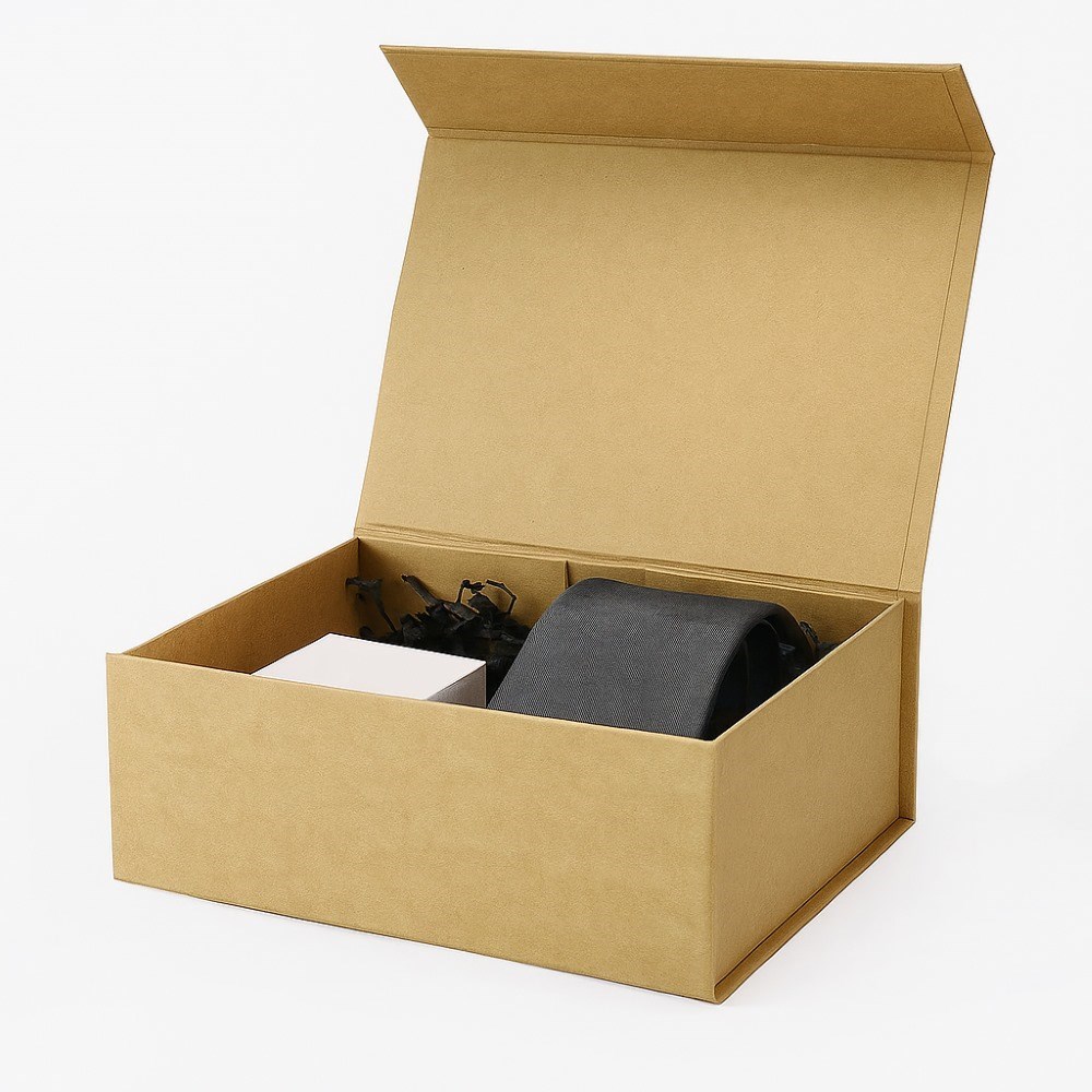 Ekskluzywne pudełko magnetyczne w rozmiarze A4 (330x255x115 mm) w naturalnym kraftowym kolorze. Wykonane z wysokiej jakości papieru powlekanego zgodnego z normą RoHS, tektury falistej oraz solidnej tektury introligatorskiej o grubości 2,3 mm. Składana konstrukcja z magnetycznym zamknięciem umożliwia szybki montaż bez użycia kleju, zapewniając elegancki wygląd i solidną ochronę produktów premium.
