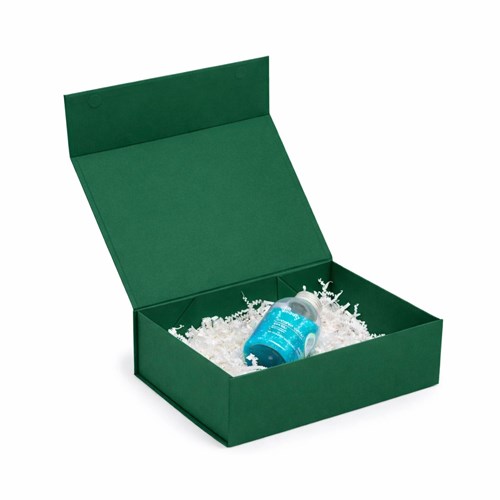 Pudełko magnetyczne o wymiarach 350×250×100 mm przeznaczone jest do pakowania produktów oraz zestawów wymagających stabilnej i estetycznej oprawy. Sztywna, lita tektura o gramaturze 850 g/m² zapewnia ochronę zawartości podczas transportu i przechowywania. Składana konstrukcja ułatwia magazynowanie pudełek przed użyciem oraz sprawne przygotowanie opakowania. Odcień leśnej zieleni Pantone 349C nadaje całości uporządkowany i naturalny charakter.