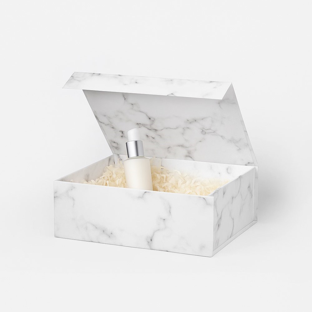 Ekskluzywne pudełko magnetyczne w rozmiarze A4 (330x255x115 mm) w efektownym, marmurowym wzorze. Wykonane z wysokiej jakości papieru powlekanego zgodnego z normą RoHS, tektury falistej oraz solidnej tektury introligatorskiej o grubości 2,3 mm. Składana konstrukcja z magnetycznym zamknięciem umożliwia szybki montaż bez użycia kleju, zapewniając prestiżową prezentację oraz solidną ochronę produktów premium.