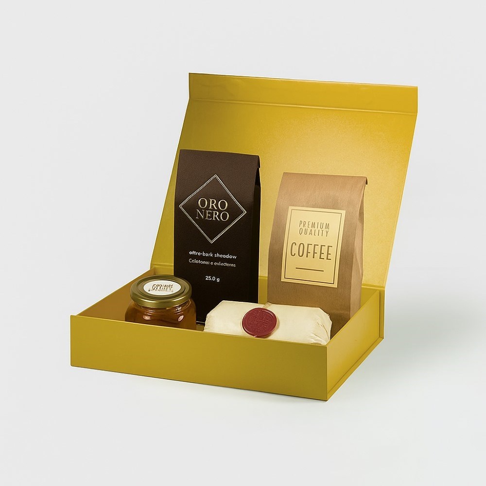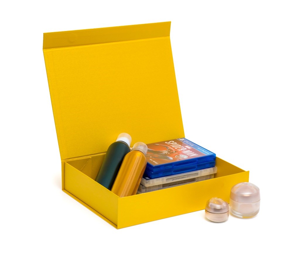 Ekskluzywne pudełko magnetyczne w rozmiarze A4 (330x255x70 mm) w eleganckim perłowym żółtym kolorze. Wykonane z wysokiej jakości papieru powlekanego zgodnego z normą RoHS, tektury falistej oraz solidnej tektury introligatorskiej o grubości 2,3 mm. Posiada matowe wykończenie odporne na zarysowania oraz półmagnetyczne zamknięcie. Składana konstrukcja pozwala na szybki montaż bez użycia kleju, oferując prestiżowy wygląd i bezpieczną ochronę produktów premium.