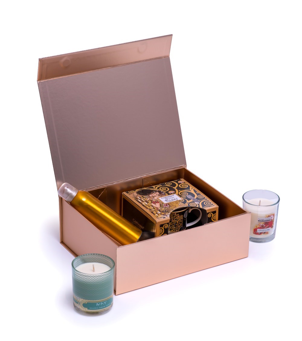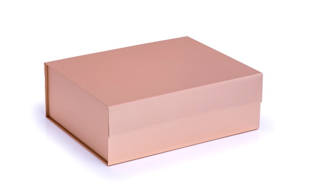 Ekskluzywne pudełko magnetyczne w rozmiarze A4 (330x255x115 mm) w eleganckim kolorze różowego złota. Wykonane z wysokiej jakości papieru powlekanego zgodnego z normą RoHS, tektury falistej oraz solidnej tektury introligatorskiej o grubości 2,3 mm. Powierzchnia dodatkowo zabezpieczona laminatem antyzarysowaniowym, zapewniając jeszcze większą trwałość. Składana konstrukcja z magnetycznym zamknięciem umożliwia szybki montaż bez użycia kleju, podkreślając luksusowy charakter opakowania.
