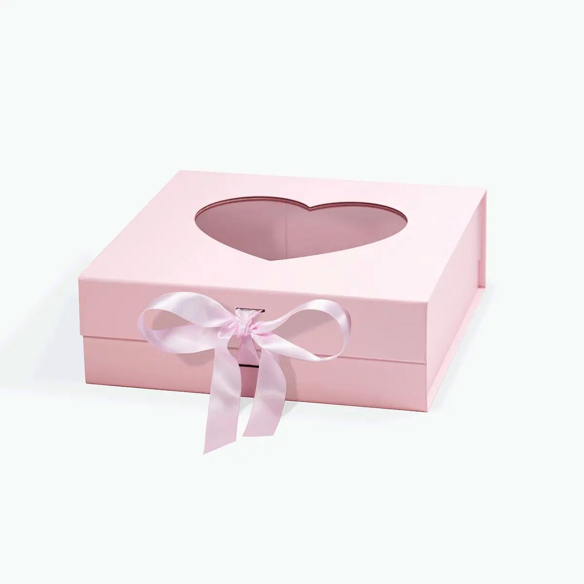 Pudełko magnetyczne kwadratowe A5 różowe z wstążką i okienkiem w kształcie serduszka 235×235×80 mm