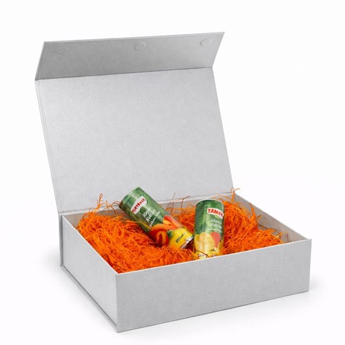 Pudełko magnetyczne o wymiarach 350×250×100 mm przeznaczone jest do estetycznego pakowania produktów wymagających solidnej i eleganckiej oprawy. Sztywna, lita tektura o wysokiej gramaturze zapewnia stabilność konstrukcji oraz ochronę zawartości. Magnetyczne zamknięcie umożliwia wygodne, wielokrotne użytkowanie. Srebrny kolor nadaje opakowaniu nowoczesny, reprezentacyjny charakter.