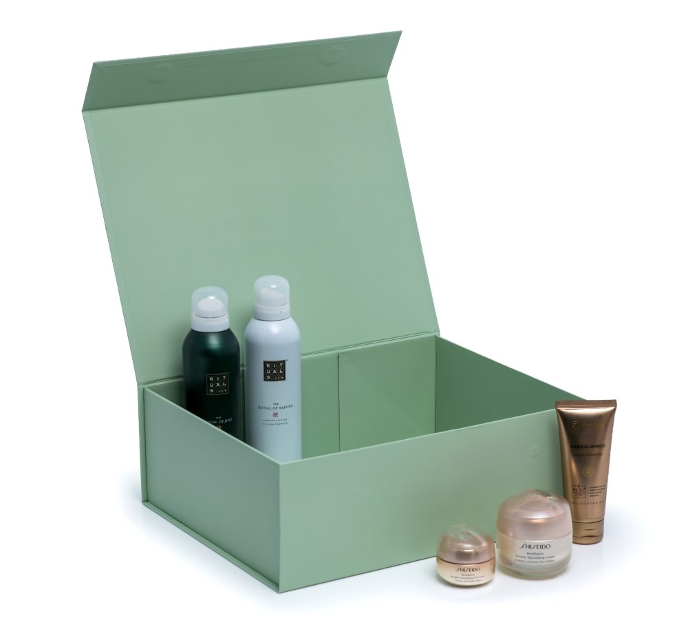 Ekskluzywne pudełko magnetyczne w rozmiarze A4 (330x255x115 mm) w modnym, szałwiowym kolorze, zbliżonym do Pantone 5595C. Wykonane z wysokiej jakości papieru powlekanego zgodnego z normą RoHS, tektury falistej oraz solidnej tektury introligatorskiej o grubości 2,3 mm. Powierzchnia dodatkowo zabezpieczona laminatem antyzarysowaniowym. Składana konstrukcja z magnetycznym zamknięciem umożliwia szybki montaż bez użycia kleju, zapewniając luksusowy wygląd i skuteczną ochronę produktów premium.