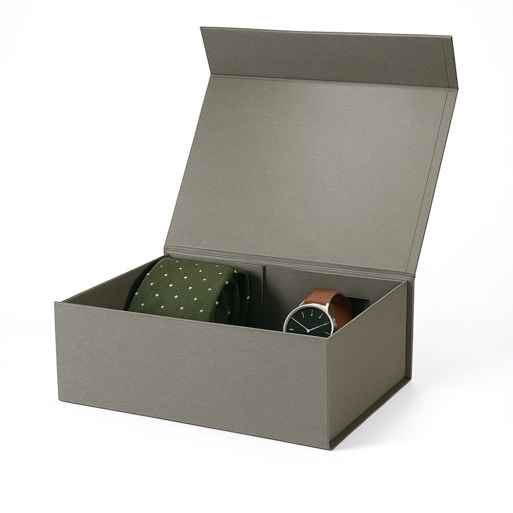 Ekskluzywne pudełko magnetyczne w rozmiarze A4 (330x255x115 mm) w eleganckim, głębokim szarym kolorze, zbliżonym do Pantone 417U. Wykonane z wysokiej jakości papieru powlekanego zgodnego z normą RoHS, tektury falistej oraz solidnej tektury introligatorskiej o grubości 2,3 mm. Składana konstrukcja z magnetycznym zamknięciem umożliwia szybki montaż bez użycia kleju, zapewniając estetyczny wygląd i niezawodną ochronę produktów premium.