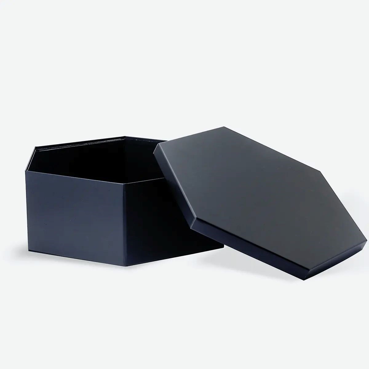 Czarne pudełko magnetyczne o sześciokątnym kształcie wyróżnia się geometryczną formą i nowoczesnym charakterem. Symetryczne proporcje oraz wyraźnie zaznaczone krawędzie nadają opakowaniu elegancki i zdecydowany wygląd. Zdejmowana pokrywa podkreśla uporządkowaną estetykę i pozwala na efektowną prezentację zawartości.