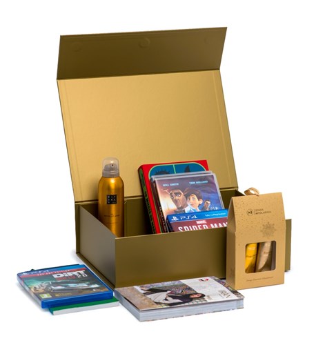 Złote magnetyczne pudełko o wymiarach 350x250x100 mm to eleganckie i luksusowe rozwiązanie do przechowywania i prezentowania wartościowych przedmiotów. Wykonane z wysokiej jakości kartonu, z solidnym magnetycznym zamknięciem, łączy w sobie prestiż i funkcjonalność.