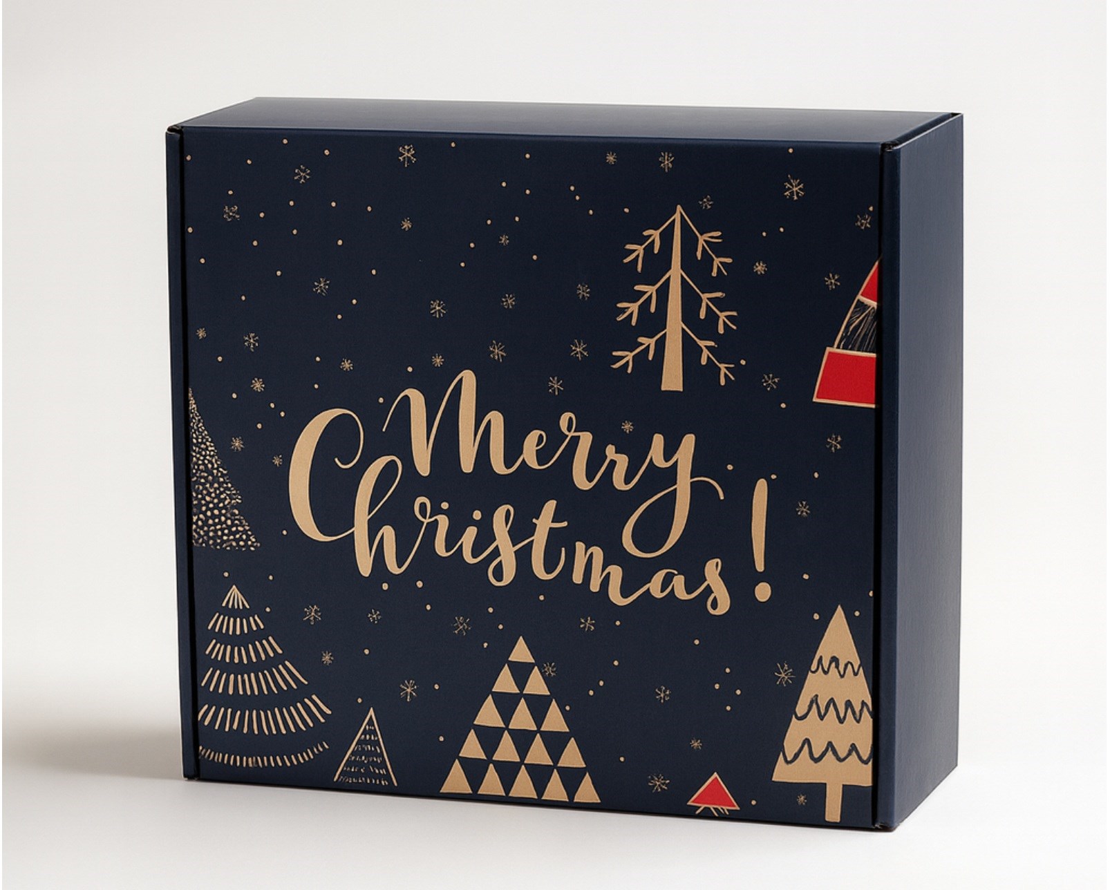Praktyczne pudełko fasonowe o wymiarach 190×180×70 mm to solidne i wygodne rozwiązanie do pakowania prezentów, upominków lub drobnych produktów. Konstrukcja typu FEFCO 0427 zapewnia stabilność, szybkie składanie oraz wygodne zamykanie. Wykonane z 3-warstwowej tektury falistej typu E o gramaturze 378 g/m², łączy lekkość z dobrą odpornością na uszkodzenia. Nadruk w kolorze granatowym z motywem świątecznym z choinką podkreśla sezonowy charakter produktu, idealnie sprawdzając się w sprzedaży detalicznej i wysyłkowej.