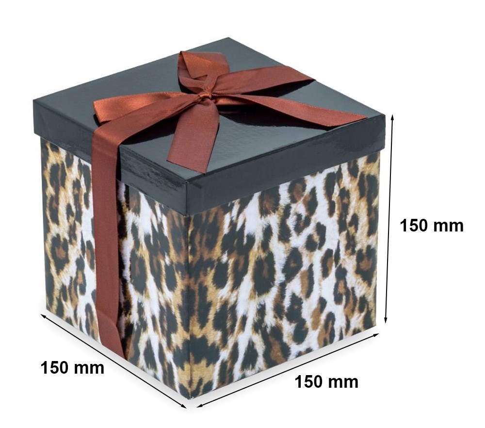 Oferujemy eleganckie pudełko na prezenty ze wzorem panterki, idealne do samodzielnego składania. W zestawie znajdują się również stylowa wstążka z kokardką oraz zawieszka na bilecik.