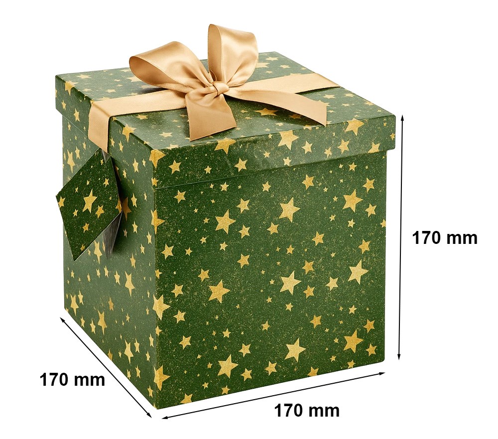 Proponujemy eleganckie pudełko składane o wymiarach 170x170x170mm, idealne na prezent dla najbliższych. Starannie wykonane z atrakcyjnym nadrukiem w postaci złotych gwiazd na zielonym tle, dodatkowo ozdobione złotą tasiemką i kokardą. To wyjątkowe opakowanie nie tylko zwiększy atrakcyjność Twojego prezentu, ale również może służyć do przechowywania drobiazgów.