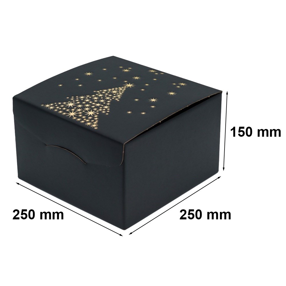 Przedstawiamy eleganckie, składane pudełko prezentowe, które jest idealnym rozwiązaniem dla każdego, kto szuka wyjątkowego opakowania na prezenty. Wymiary 250x250x150 mm zapewniają odpowiednią pojemność, a estetyczne wykonanie z czarną tekturą i złotymi zdobieniami dodaje klasy każdemu podarunkowi.