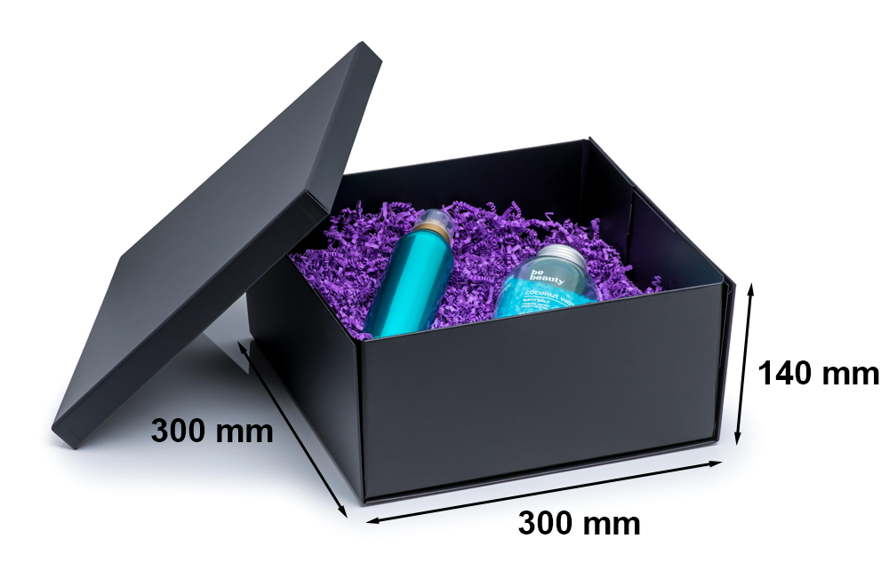 Stylowe i solidne pudełko z wieczkiem w czarnym matowym wykończeniu to doskonały wybór dla marek premium. Wymiary zewnętrzne 300x300x140 mm czynią je idealnym do pakowania większych zestawów prezentowych, tekstyliów, dekoracji i produktów handmade. Składana konstrukcja pozwala zaoszczędzić miejsce podczas przechowywania i transportu.