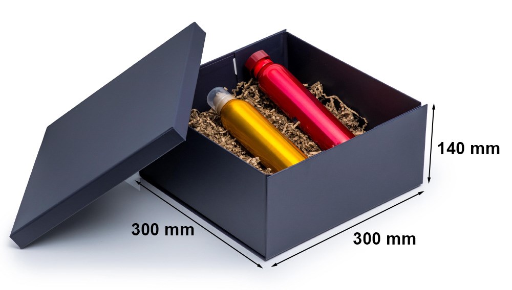 Eleganckie pudełko z wieczkiem w kolorze grafitowym (zbliżonym do RAL 7024) to propozycja dla tych, którzy cenią nowoczesne, stonowane wzornictwo. Wymiary zewnętrzne 300x300x140 mm czynią je idealnym opakowaniem dla dużych produktów premium – takich jak tekstylia, akcesoria, dekoracje lub zestawy prezentowe. Składana forma ułatwia montaż i oszczędza miejsce podczas przechowywania.