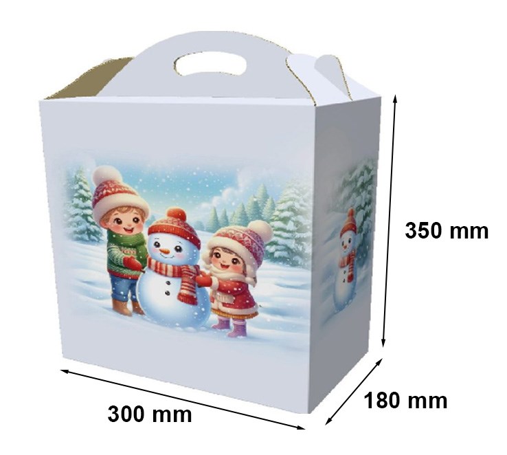 Pudełko z uchwytem BAŁWANEK to idealne rozwiązanie na świąteczne prezenty oraz dekoracje. Wykonane z wysokiej jakości kartonu o gramaturze 400 g/m², zapewnia odpowiednią trwałość, a jego biały kolor z urokliwym wzorem bałwanka i dzieci wprowadza radosny, zimowy klimat. Uchwyt ułatwia przenoszenie pudełka, co czyni je praktycznym wyborem na każdą okazję. Fasonowa konstrukcja umożliwia łatwe składanie i przechowywanie, gdy nie jest używane.