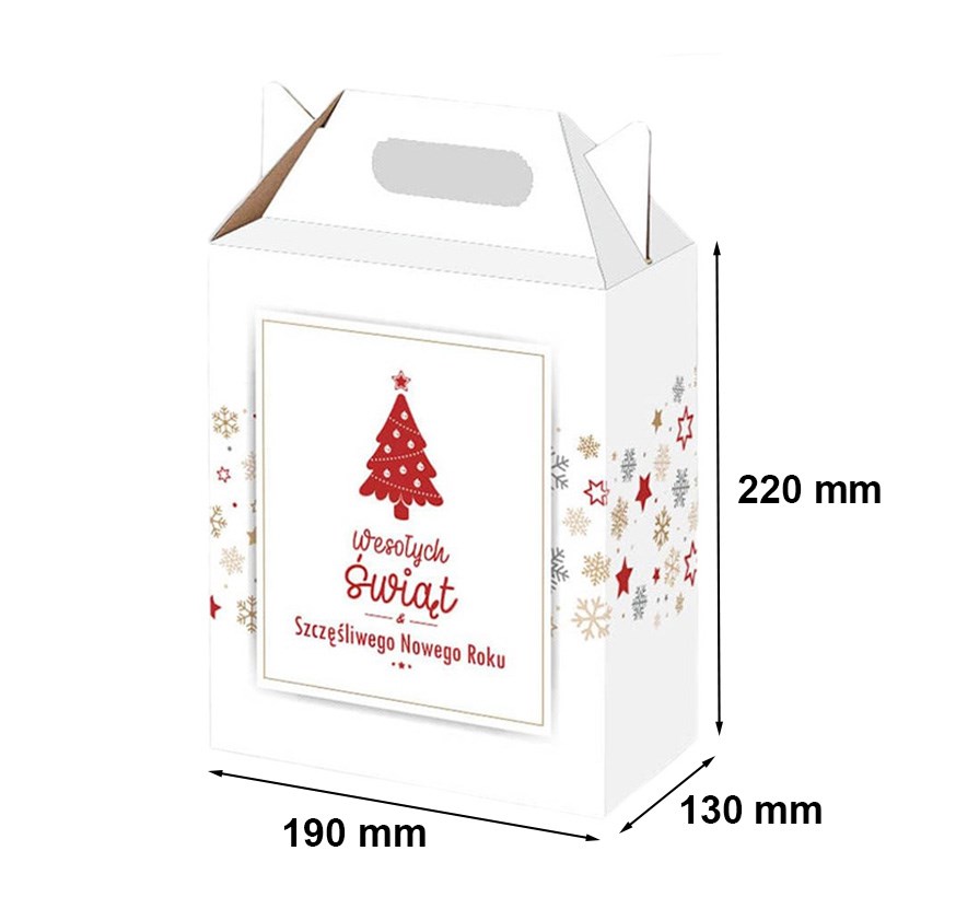 Prezentujemy pudełko świąteczne, idealne do eleganckiego opakowania prezentów na Boże Narodzenie lub Mikołajki. Ten kartonik z efektownym, świątecznym nadrukiem "Wesołych Świąt i Szczęśliwego Nowego Roku" pozwala szybko i estetycznie zapakować każdy upominek.