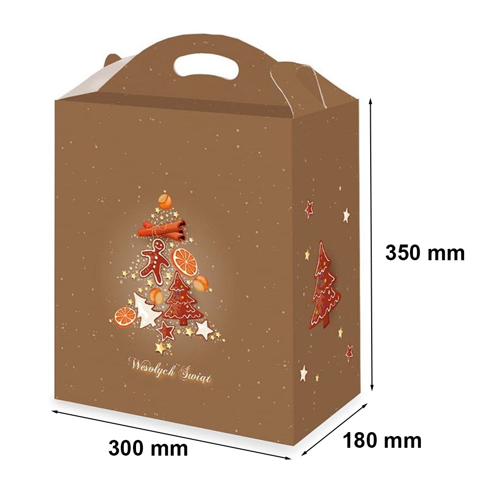 - Motyw: Brązowe opakowanie z świątecznym wzorem