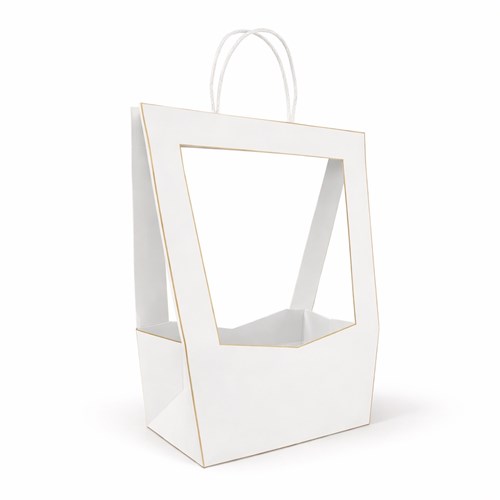 Torba prezentowa otwarta w kolorze białym o wymiarach 120 × 100 × 350 mm to opakowanie przeznaczone do pakowania roślin doniczkowych oraz drobnych produktów.