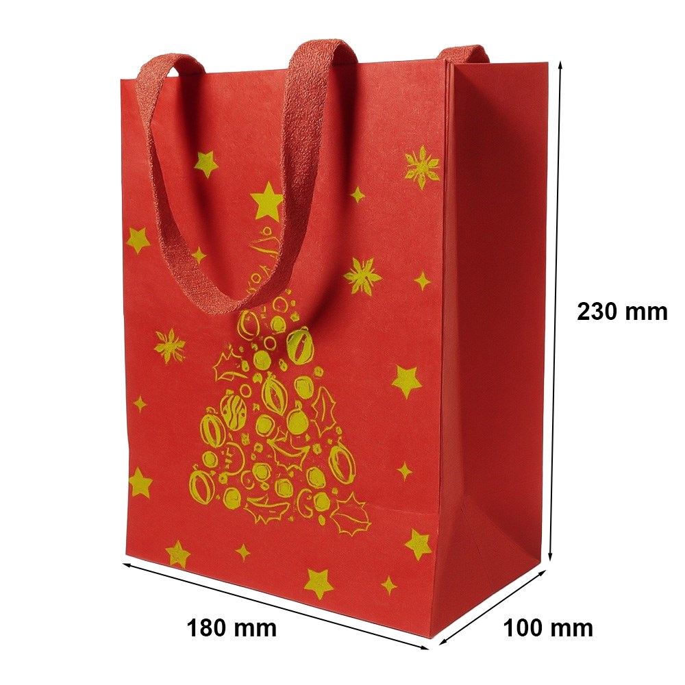 Praktyczna torba prezentowa KRAFT w kolorze czerwonym o wymiarach 180 × 100 × 230 mm to wygodne rozwiązanie do pakowania drobnych upominków. Wykonana z papieru kraft o gramaturze 180 g/m², cechuje się estetycznym wyglądem i odpowiednią trwałością. Motyw świąteczny z choinką nadaje jej wyjątkowego charakteru, dzięki czemu doskonale sprawdzi się w sezonie bożonarodzeniowym.