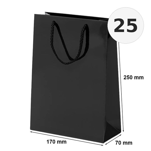 Torba laminowana w kolorze czarny o wymiarach 170×70×250 mm przeznaczona do pakowania produktów, materiałów firmowych oraz zestawów prezentowych.