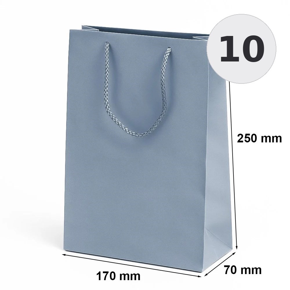 Torba laminowana w kolorze srebrny o wymiarach 170×70×250 mm przeznaczona do pakowania produktów, materiałów firmowych oraz zestawów prezentowych.
