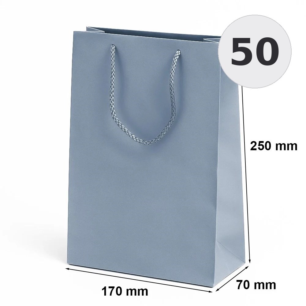 Torba laminowana w kolorze srebrny o wymiarach 170×70×250 mm przeznaczona do pakowania produktów, materiałów firmowych oraz zestawów prezentowych.