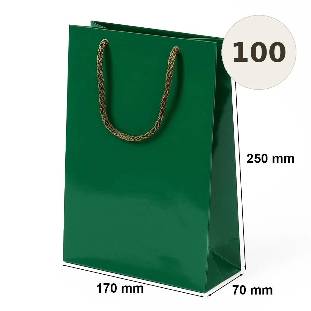 Torba laminowana w kolorze zielony o wymiarach 170×70×250 mm przeznaczona do pakowania produktów, materiałów firmowych oraz zestawów prezentowych.