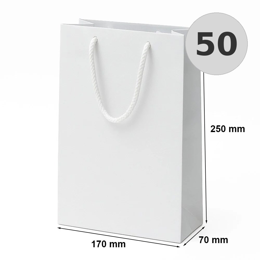 Torba laminowana w kolorze biały o wymiarach 170×70×250 mm przeznaczona do pakowania produktów, materiałów firmowych oraz prezentów.